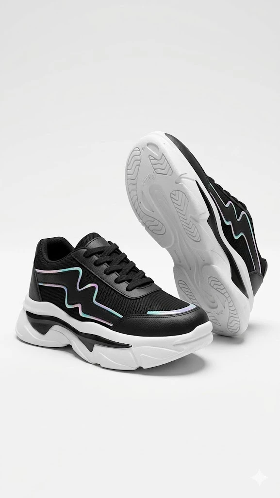 Give your child the perfect blend of comfort and "wow" factor with these premium chunky sneakers. Designed for the modern kid, these shoes feature a sleek black upper accented with holographic iridescent piping that shifts colors in the light.