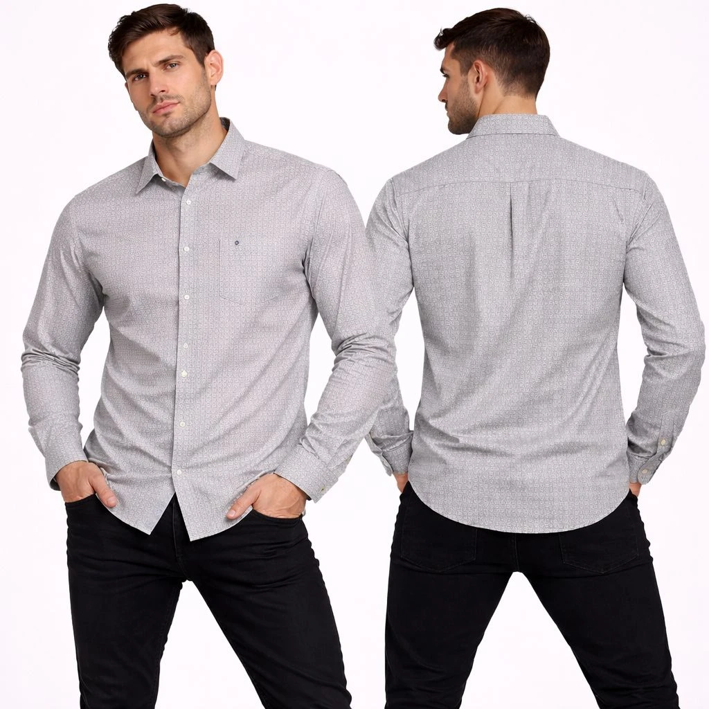 Bring a sharp, modern edge to your wardrobe with our Men’s Micro-Print Cotton Shirt. Presented in a versatile light grey, this shirt features an intricate all-over geometric pattern that adds texture and visual depth. Crafted from 100% premium cotton, it provides a crisp, breathable feel that stays comfortable from your morning meeting to an evening dinner.